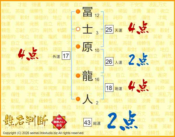 冨士原龍人さんの総運は43画の2点!
