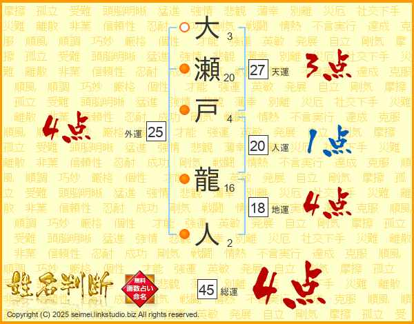 大(3画)瀬(20画)戸(4画) 龍(16画)人(2画)