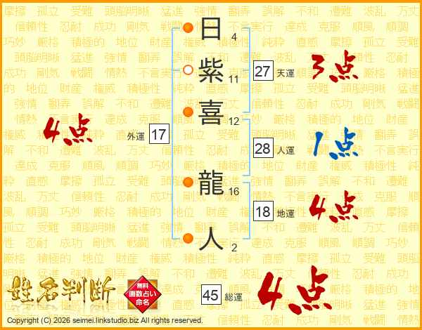 日紫喜龍人さんの総運は45画の4点!