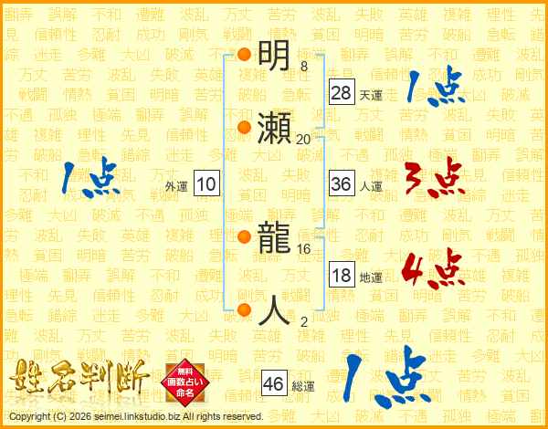 明(8画)瀬(20画) 龍(16画)人(2画)