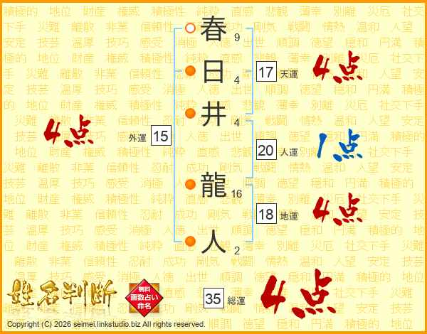 春(9画)日(4画)井(4画) 龍(16画)人(2画)
