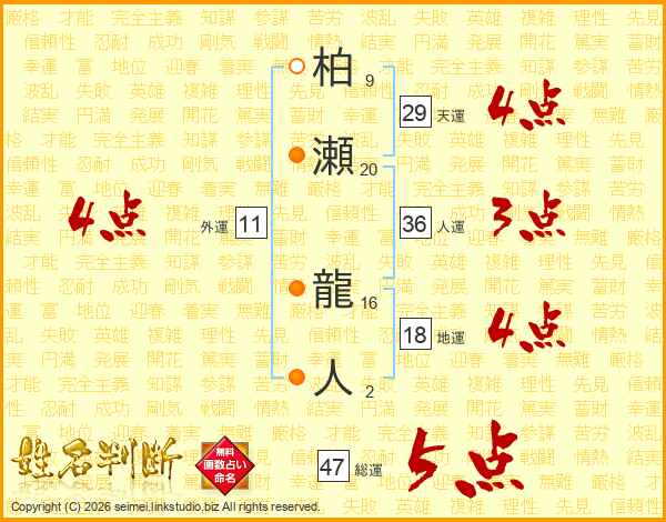 柏(9画)瀬(20画) 龍(16画)人(2画)