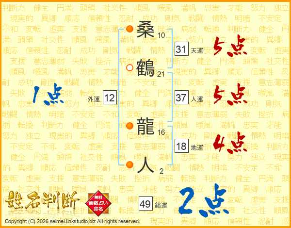 桑(10画)鶴(21画) 龍(16画)人(2画)