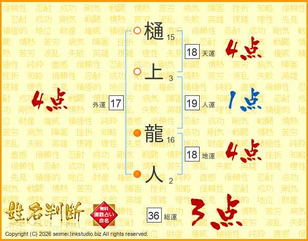 生活面を象徴する運勢です。外部から受ける影響力を表し、結婚運、家庭運や職場、環境への順応性を表します。総運から人運を引いた画数。姓や名が1文字の場合を除く。