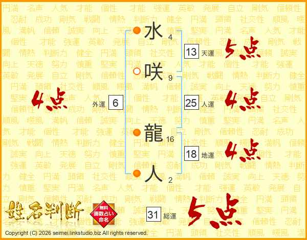 生活面を象徴する運勢です。外部から受ける影響力を表し、結婚運、家庭運や職場、環境への順応性を表します。総運から人運を引いた画数。姓や名が1文字の場合を除く。