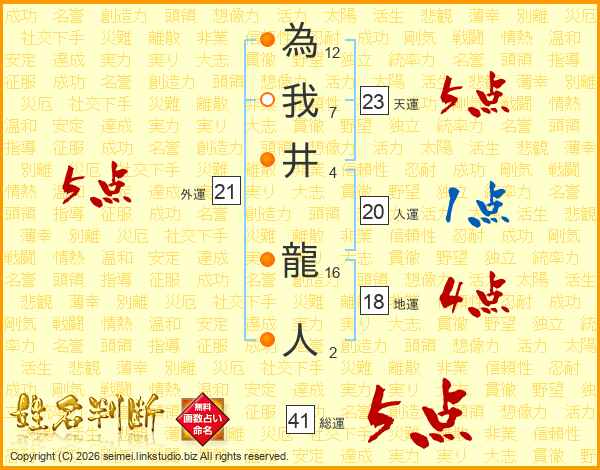 為我井龍人さんの総運は41画の5点!