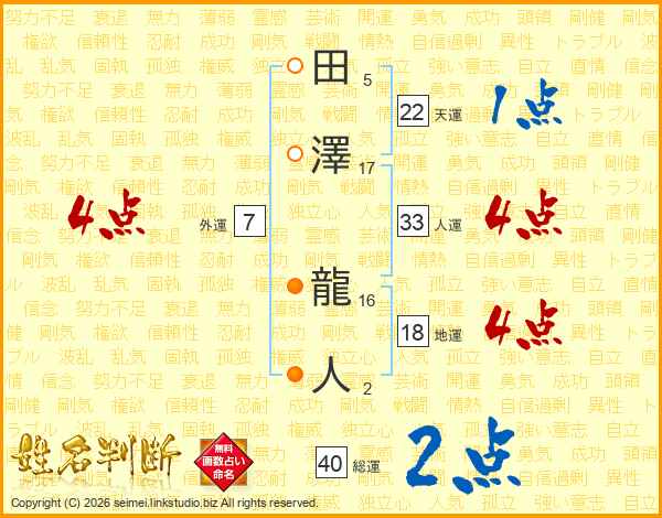 生活面を象徴する運勢です。外部から受ける影響力を表し、結婚運、家庭運や職場、環境への順応性を表します。総運から人運を引いた画数。姓や名が1文字の場合を除く。