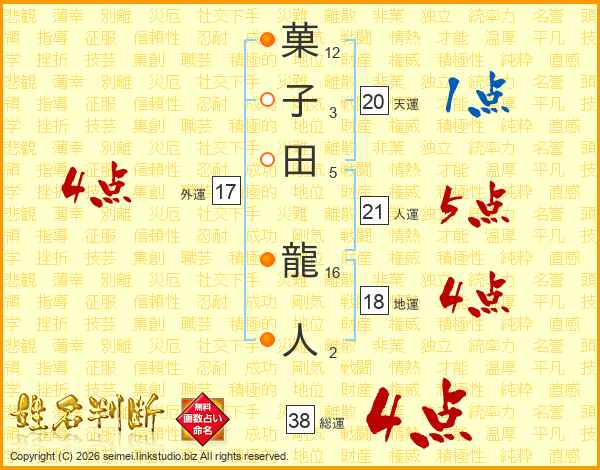 菓子田龍人さんの総運は38画の4点!
