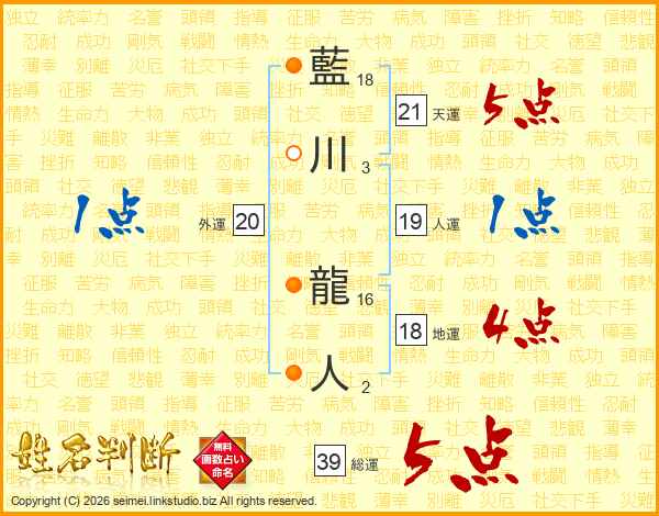 藍川龍人さんの総運は39画の5点!