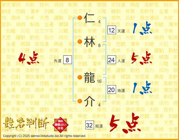 生活面を象徴する運勢です。外部から受ける影響力を表し、結婚運、家庭運や職場、環境への順応性を表します。総運から人運を引いた画数。姓や名が1文字の場合を除く。