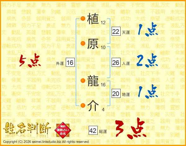 植(12画)原(10画) 龍(16画)介(4画)