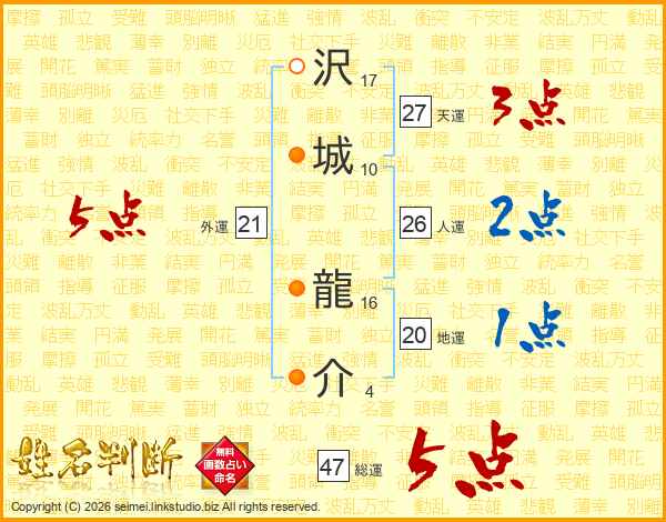 沢(17画)城(10画) 龍(16画)介(4画)