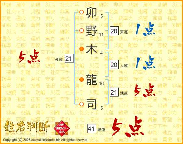 卯(5画)野(11画)木(4画) 龍(16画)司(5画)