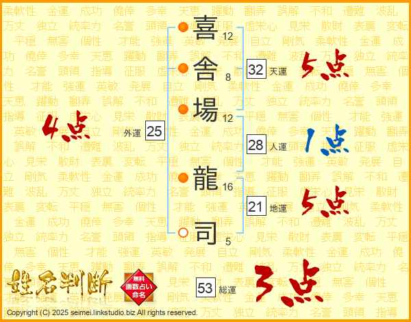 喜(12画)舎(8画)場(12画) 龍(16画)司(5画)