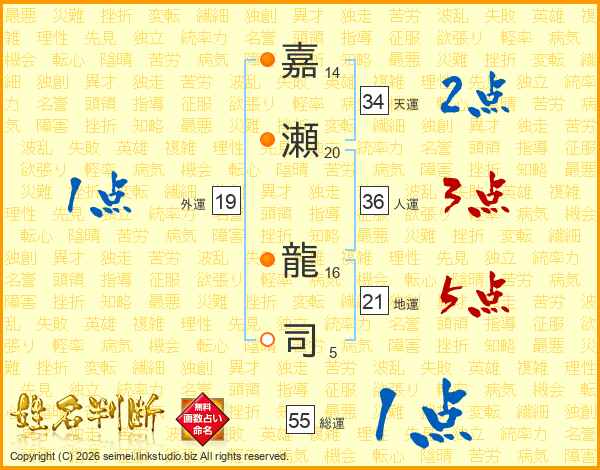 嘉(14画)瀬(20画) 龍(16画)司(5画)