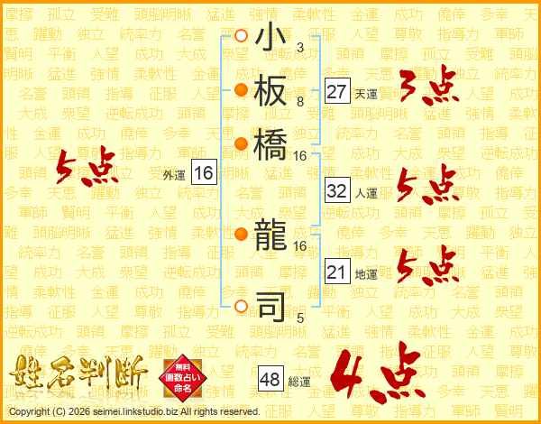 小(3画)板(8画)橋(16画) 龍(16画)司(5画)