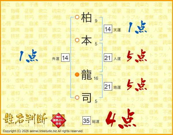 生活面を象徴する運勢です。外部から受ける影響力を表し、結婚運、家庭運や職場、環境への順応性を表します。総運から人運を引いた画数。姓や名が1文字の場合を除く。