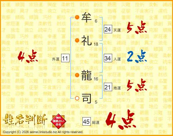 牟(6画)礼(18画) 龍(16画)司(5画)