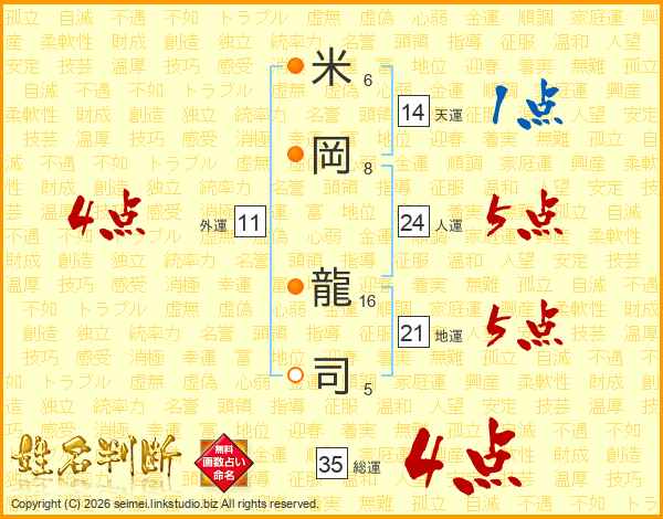 生活面を象徴する運勢です。外部から受ける影響力を表し、結婚運、家庭運や職場、環境への順応性を表します。総運から人運を引いた画数。姓や名が1文字の場合を除く。