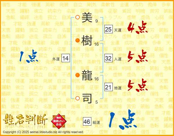 生活面を象徴する運勢です。外部から受ける影響力を表し、結婚運、家庭運や職場、環境への順応性を表します。総運から人運を引いた画数。姓や名が1文字の場合を除く。