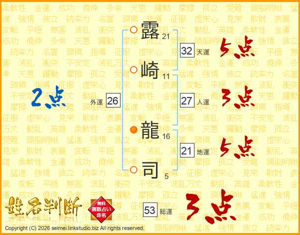家系が持つ宿命的な運勢を表します。祖先から受け継いだ苗字ですので自分の力が及びません。家柄を象徴します。苗字の合計画数。