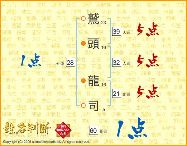 鷲(23画)頭(16画) 龍(16画)司(5画)