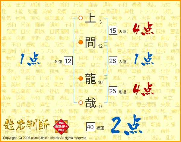 生活面を象徴する運勢です。外部から受ける影響力を表し、結婚運、家庭運や職場、環境への順応性を表します。総運から人運を引いた画数。姓や名が1文字の場合を除く。
