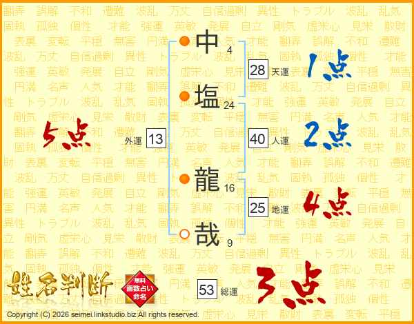 中(4画)塩(24画) 龍(16画)哉(9画)