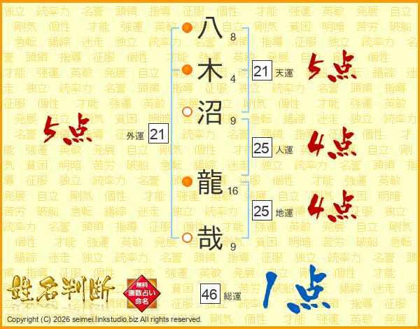 八(8画)木(4画)沼(9画) 龍(16画)哉(9画)