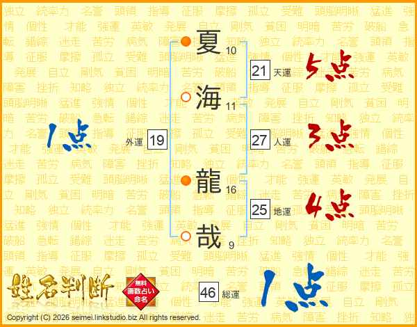 夏(10画)海(11画) 龍(16画)哉(9画)
