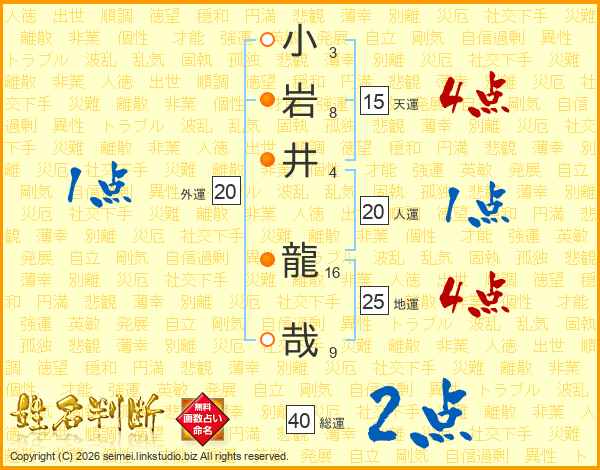 小(3画)岩(8画)井(4画) 龍(16画)哉(9画)