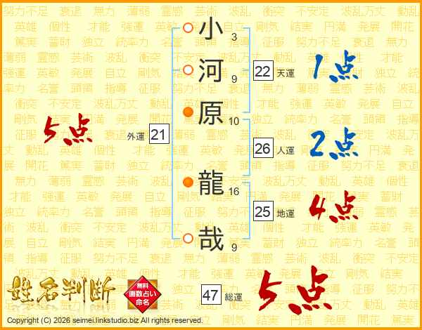 小(3画)河(9画)原(10画) 龍(16画)哉(9画)