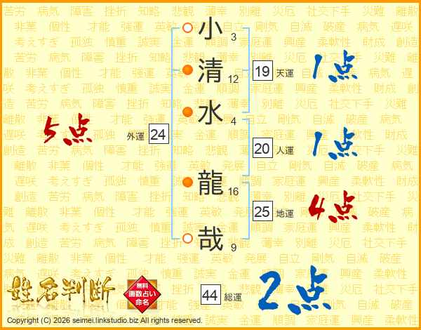 小(3画)清(12画)水(4画) 龍(16画)哉(9画)