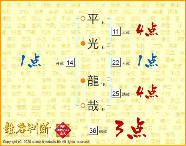 生活面を象徴する運勢です。外部から受ける影響力を表し、結婚運、家庭運や職場、環境への順応性を表します。総運から人運を引いた画数。姓や名が1文字の場合を除く。