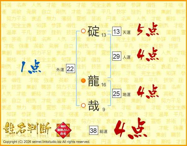生活面を象徴する運勢です。外部から受ける影響力を表し、結婚運、家庭運や職場、環境への順応性を表します。総運から人運を引いた画数。姓や名が1文字の場合を除く。