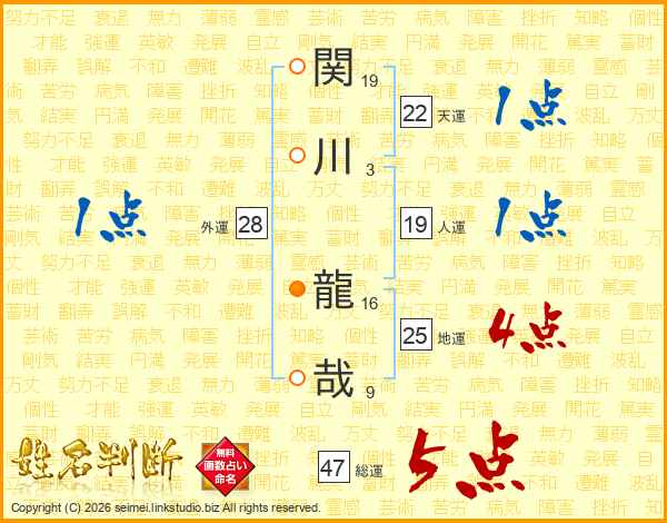 関(19画)川(3画) 龍(16画)哉(9画)
