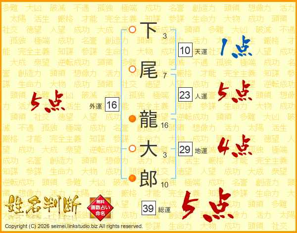 下尾龍大郎さんの総運は39画の5点!
