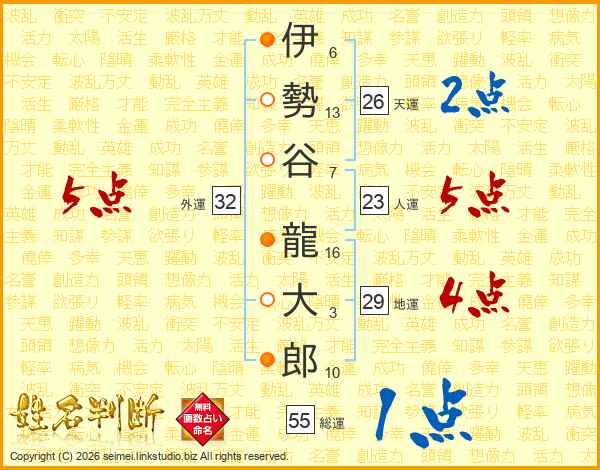 伊(6画)勢(13画)谷(7画) 龍(16画)大(3画)郎(10画)