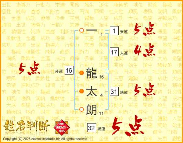あなたの人生を表す1番重要な運勢です。生涯を通じて影響する総合運となり、主に50歳以降の晩年期に影響を及ぼします。苗字と名前の合計画数。