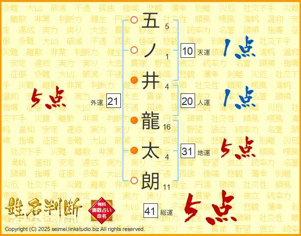 五(5画)ノ(1画)井(4画) 龍(16画)太(4画)朗(11画)
