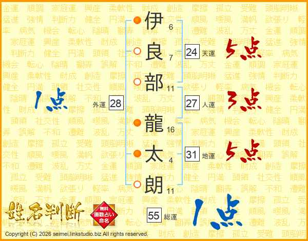 伊(6画)良(7画)部(11画) 龍(16画)太(4画)朗(11画)