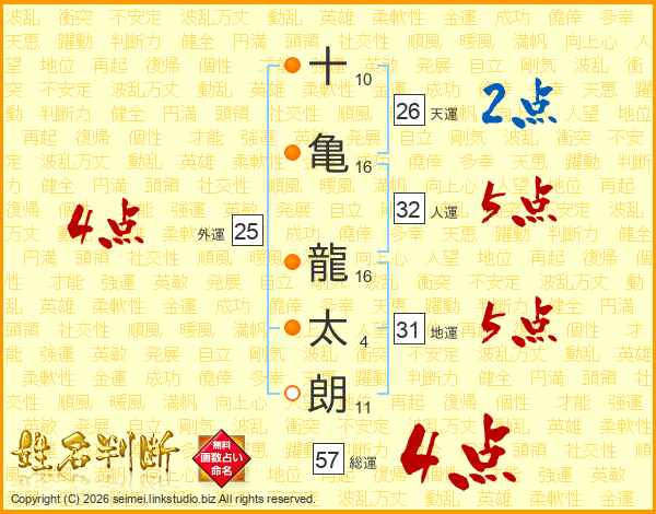 十(10画)亀(16画) 龍(16画)太(4画)朗(11画)