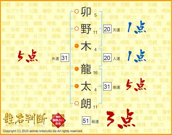 卯(5画)野(11画)木(4画) 龍(16画)太(4画)朗(11画)