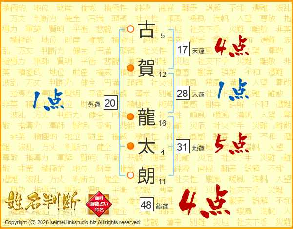 古(5画)賀(12画) 龍(16画)太(4画)朗(11画)