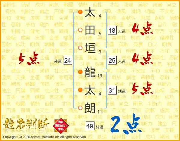 太(4画)田(5画)垣(9画) 龍(16画)太(4画)朗(11画)
