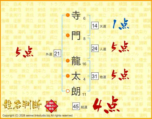 寺門龍太朗さんの総運は45画の4点!