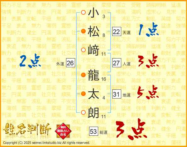 小(3画)松(8画)﨑(11画) 龍(16画)太(4画)朗(11画)