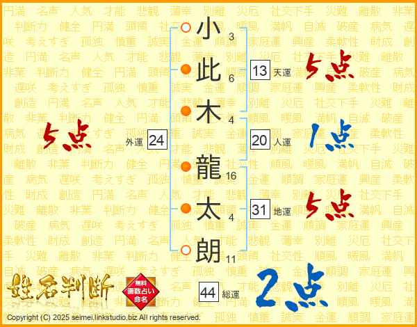 小(3画)此(6画)木(4画) 龍(16画)太(4画)朗(11画)