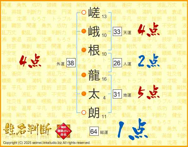 嵯(13画)峨(10画)根(10画) 龍(16画)太(4画)朗(11画)
