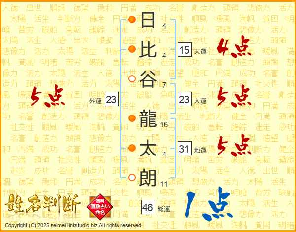 日(4画)比(4画)谷(7画) 龍(16画)太(4画)朗(11画)